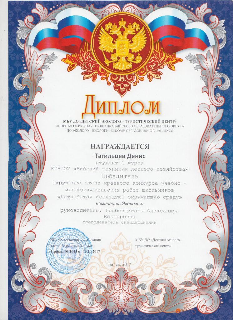 На участие в окружном этапе конкурса было заявлено 18 работ по четырем номинациям: биология, экология, краеведение, водные проекты старшеклассников. В номинации экология принял участие студент 1 курса Бийского техникума лесного хозяйства — Тагильцев Денис.